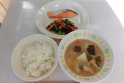 【献立】ごはん・鮭の塩焼き・こまつなのひたし・みそ汁・牛乳