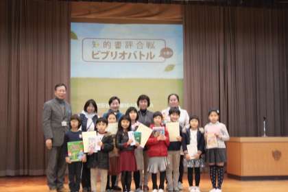 9人の立派な出場者たちとゲストで記念撮影をして、第1回ビブリオバトルin若小は大成功を収めたのでした。