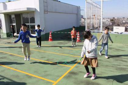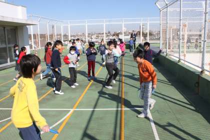 暖かい日差しの中で、元気いっぱいになわとびに取り組む若小の子達。