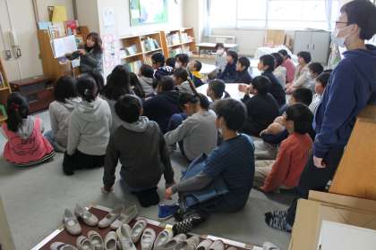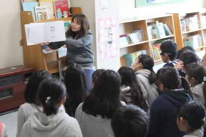 5年生は図書の時間に、学校図書館司書の先生に絵本の読み聞かせをしてもらいました。