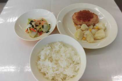 【献立】ごはん・豆腐入りハンバーグ・和風ソース・こく旨粉ふきいも