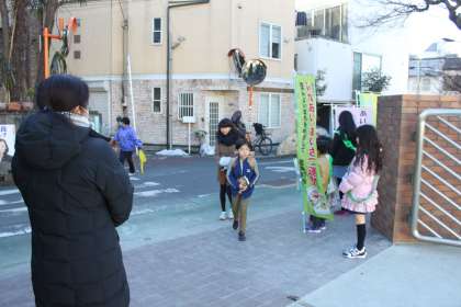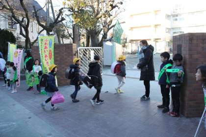 池に氷が張るくらいの寒さになりましたが、今朝も若小班あいさつ運動が行われました。