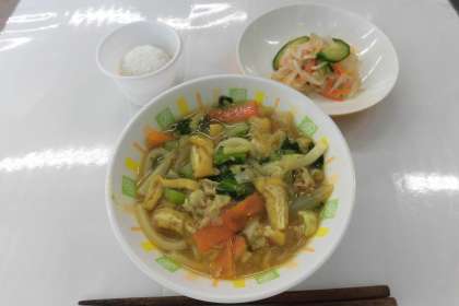 【献立】カレーうどん・野菜の甘酢かけ・おからのスノーボール・牛乳