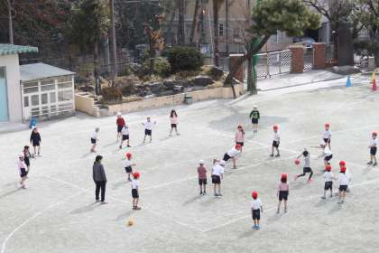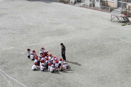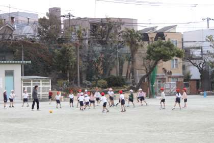 先生の説明をきちんと聞き、校庭で元気いっぱいにドッジボールに取り組みます。
