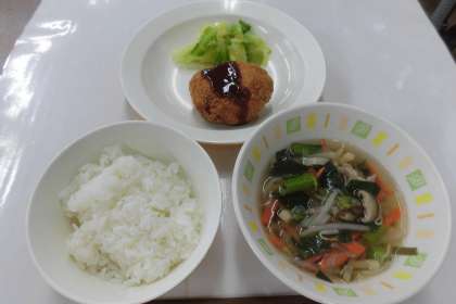 【献立】ごはん・おからコロッケ・キャベツのカレーピクルス・沢煮椀・牛乳