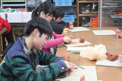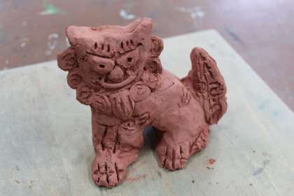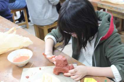 赤土の粘土をよくこねて、かわいい作品に仕上げます。