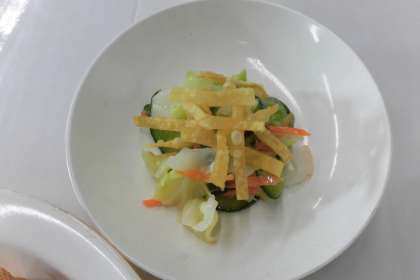 野菜の上にのっているのは、わんたんの皮を油で揚げたものです。ぱりぱりっとした食感が名前の由来となりました。