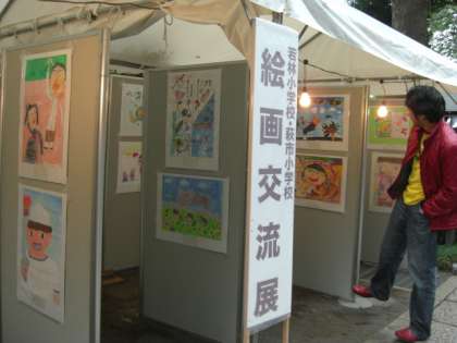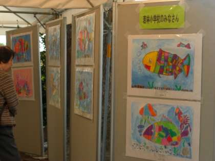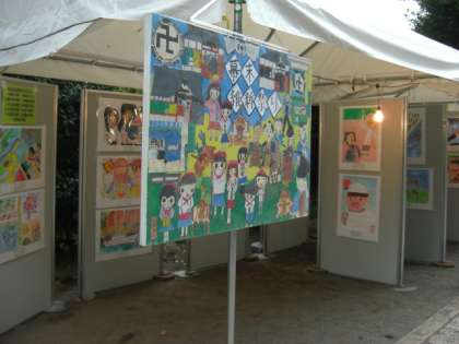 萩市の小学校と若林小学校の絵画を幕末維新祭の折の松陰神社の境内に展示していただいています。若林小学校では、1年生から4年生までのいろいろな絵画の作品を展示しました。子供たちの絵画の展示は、ほっとする空間になっていました。