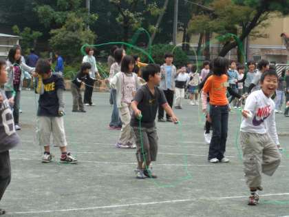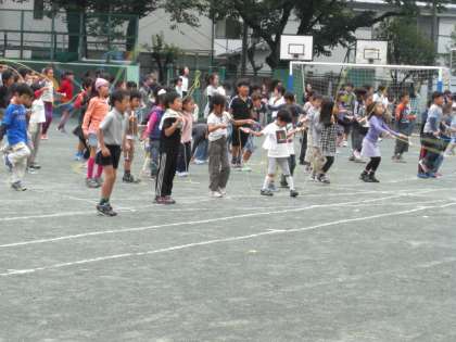 今日の全校朝会は、短縄跳び朝会でした。1年生から6年生までで1回旋1跳躍の跳び方で跳びました。「若小チャレンジ」として、一人一人短縄跳びに挑戦していきます。