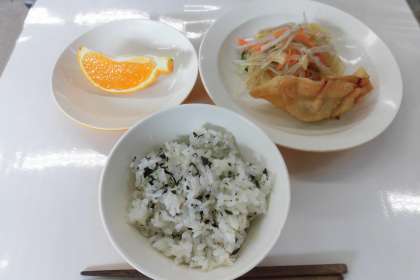 【献立】わかめごはん・ジャンボ餃子・春雨サラダ・デコポン・牛乳