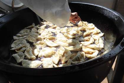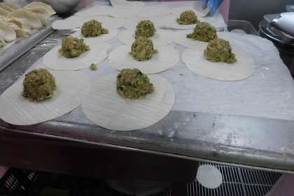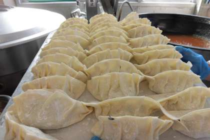調理師さんたちは、不公平にならないように、中身の重さを1個ずつ量って皮にのせ、襞をつけながら包んでいきます。大きな揚げ物用の釜で揚げます。きれいなきつね色になるように、途中何度もかえしながら揚げます