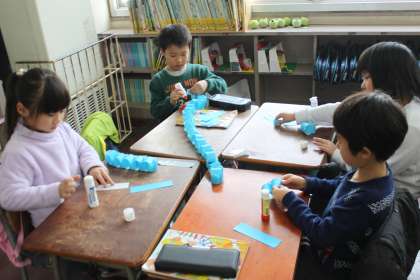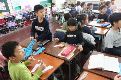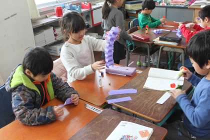 1年生が体育館に飾るために輪飾りをつくっています。
