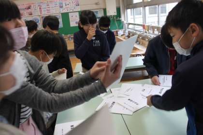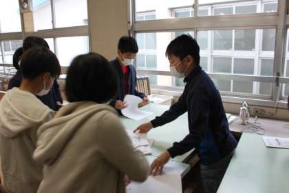 5年生は、卒業式の中で発表する「門出の言葉」の台本綴じをしました。