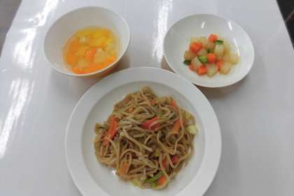 【献立】ソース焼きそば・コロコロ野菜・フルーツパンチ・牛乳