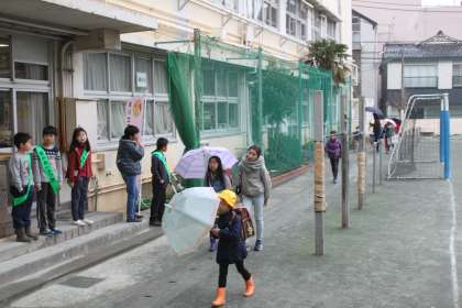 玄関のひさしのところで雨を避けながら元気いっぱいの声が響きます。
