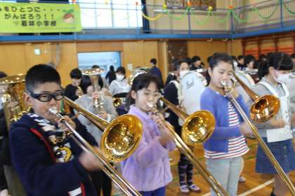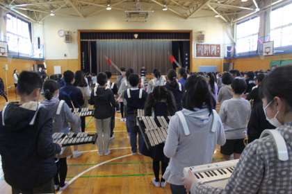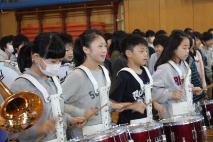 今朝も若小マーチを演奏し、全校朝会の締めくくりを行いました。