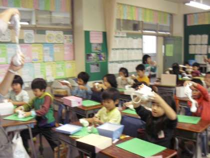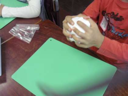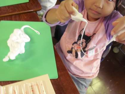 初めに、袋から出した紙粘土を柔らかくするために、みんなで「ねんど体操」をしました。子供たちはにぎって丸めたり、どこまでのびるか引っ張ってみたり、紙粘土の感触を楽しんでいました。