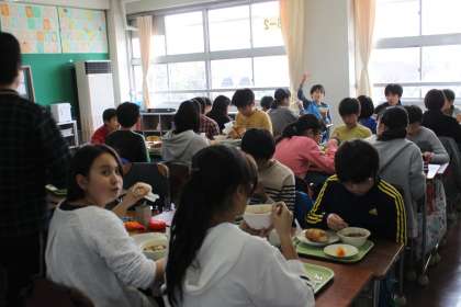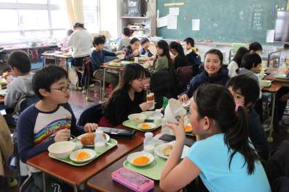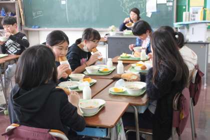 大人気のあげパンをみんなで美味しく食べる6年生。