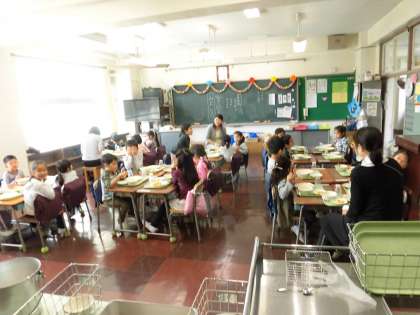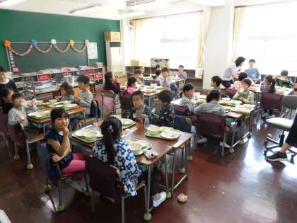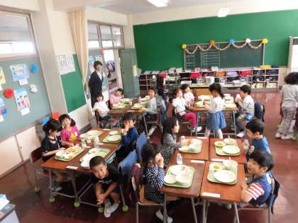 初めて食べる若小の給食は、チキンライスにコーンシチュー、そしてオレンジ。