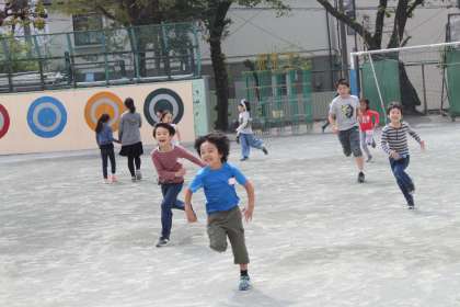 かわいい1年生が若小の校庭を元気いっぱいに走り回ります。