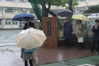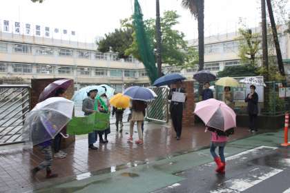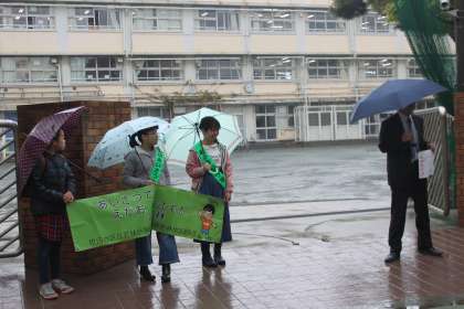 今朝も地域の方が来てくださり、元気いっぱいの若小正門前の様子です。
