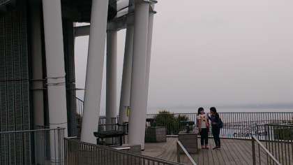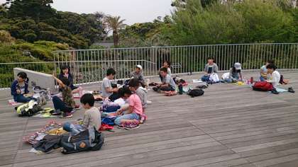 オリエンテーリングの後は昼食の時間です。展望灯台から階段で降りてくる友達を励ます姿も見られました。