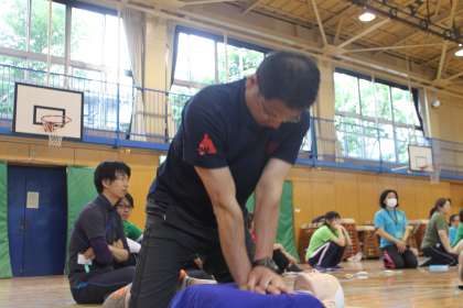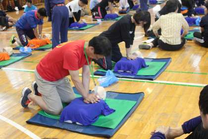 心肺蘇生法に人工呼吸、AEDの使い方までフルコースです。