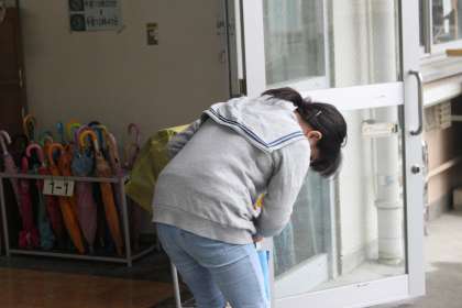 傘たたみが苦手な子には、6年生が協力!