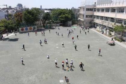 休み時間の校庭では、子どもたちが元気いっぱいに遊んでいます。