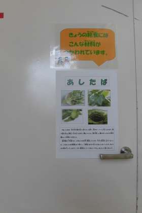 あしたばの説明を写真入りで作り、給食室の入り口に掲示したり、給食といっしょに教室に配布したりしました。