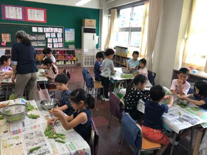 1組から3組まで、73人の1年生たちの手で、鞘むきが終わりました。