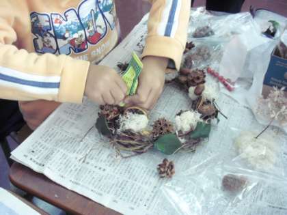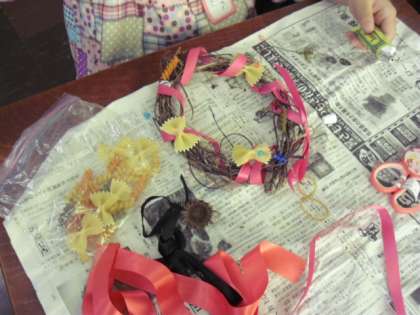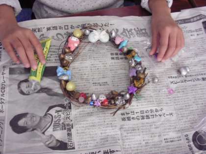 どんぐり、まつぼっくり、マカロニ、ボタン、ビーズ、リボンなどで飾り付け。