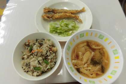 【献立】豆入りひじきごはん・ししゃものてんぷら・キャベツの甘酢かけ