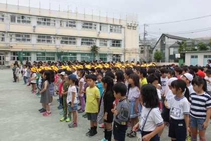 全校でのあいさつの後、準備運動して長なわにチャレンジです。