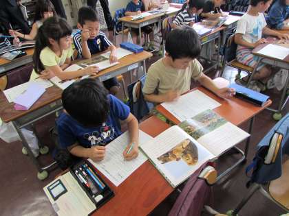教科書の学びをより確かなものとするために、本校では学校図書館を積極的に活用しています。先日行われた2年生の研究授業では、「時間の順序や事柄の順序を表す言葉」を借りた本から探し、ワークシートにまとめ、たくさんの種類があることに気付くことができました。これをもとに、教科書の説明文「つばめのすだち」を読んでいきます。この説明文にも多くの順序を表す言葉が出てきます。