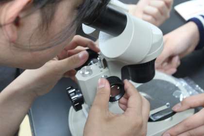 ビニール袋に入れたメダカの尾びれを顕微鏡で観察すると、透明な身体なので血管まで見えます。