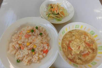 【献立】鮭ピラフ・じゃがいものハニーサラダ・卵スープ・牛乳