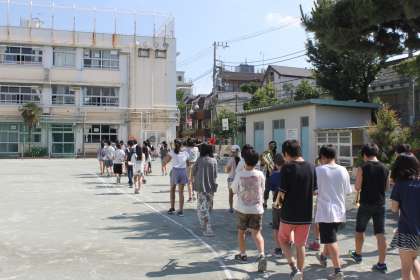 全校朝会の後に、恒例の鼓笛パレードを行う6年生。