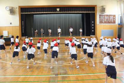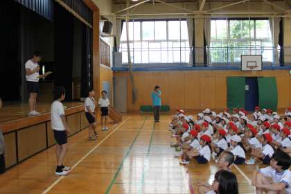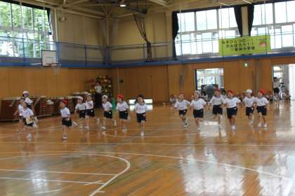 毎年若小では、1年生のシャトルランを6年生がお手伝いすることになっています。