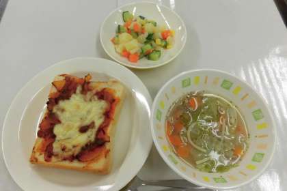 【献立】ピザトースト・マセドアンサラダ・ヌードルスープ・牛乳