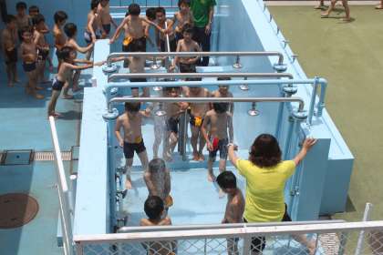 準備体操に続いて、若小名物のシャワーを味わう1年生たち。