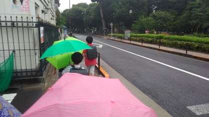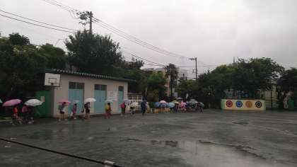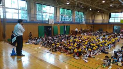 不審者事案が発生したことを想定して、全員、下校準備を整えて体育館に集合します。