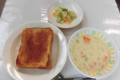 【献立】シナモントースト・コーンシチュー・キャベツとアスパラのサラダ