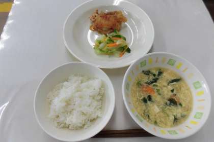 【献立】ごはん・とり肉のマーマレードソース・ゆで野菜・かきたま汁・牛乳