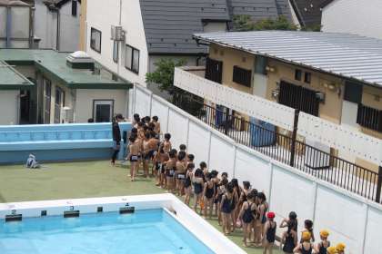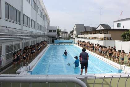 校長先生のお話を伺ったあと、プールに向かって全員で礼。