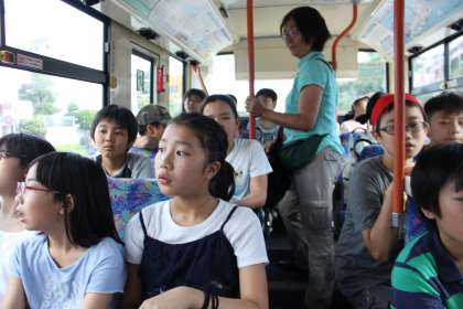 しっかりとした出発式を経て、路線バスに乗り込む6年生。