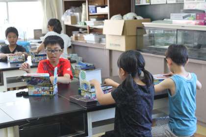 電池で動くモーターを組み合わせ、クルマを走らせたり、風車を回したり。