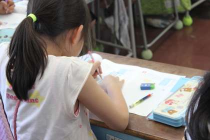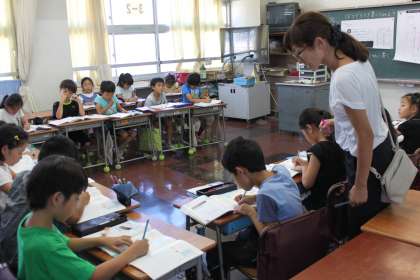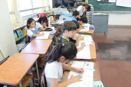 すぐ後に控える保護者会に向けて、コの字型の机の配置で学習をします。