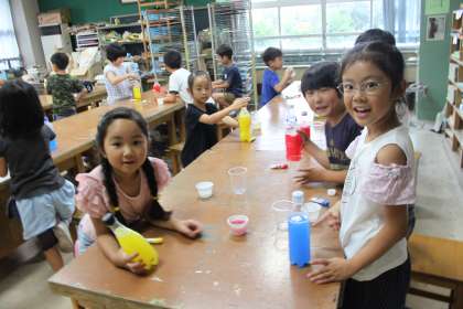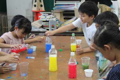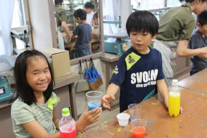 子どもたちも楽しそうに色水を混ぜ合わせています。