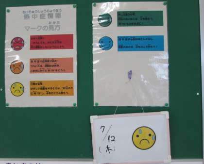 毎日暑いので、校庭で遊ぶ子どもたちの熱中症がとても心配です。本校の職員もかなり神経質に熱中症計とにらめっこしながら、子どもたちの様子を見守っています。天気の良い日は思いっきり遊ばせてあげたいのですが。養護教諭が写真のような掲示物を貼り、子どもたちに注意喚起していました。とても分かりやすいので感心させられました。